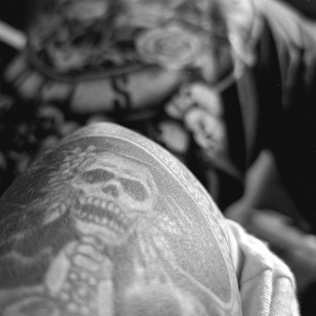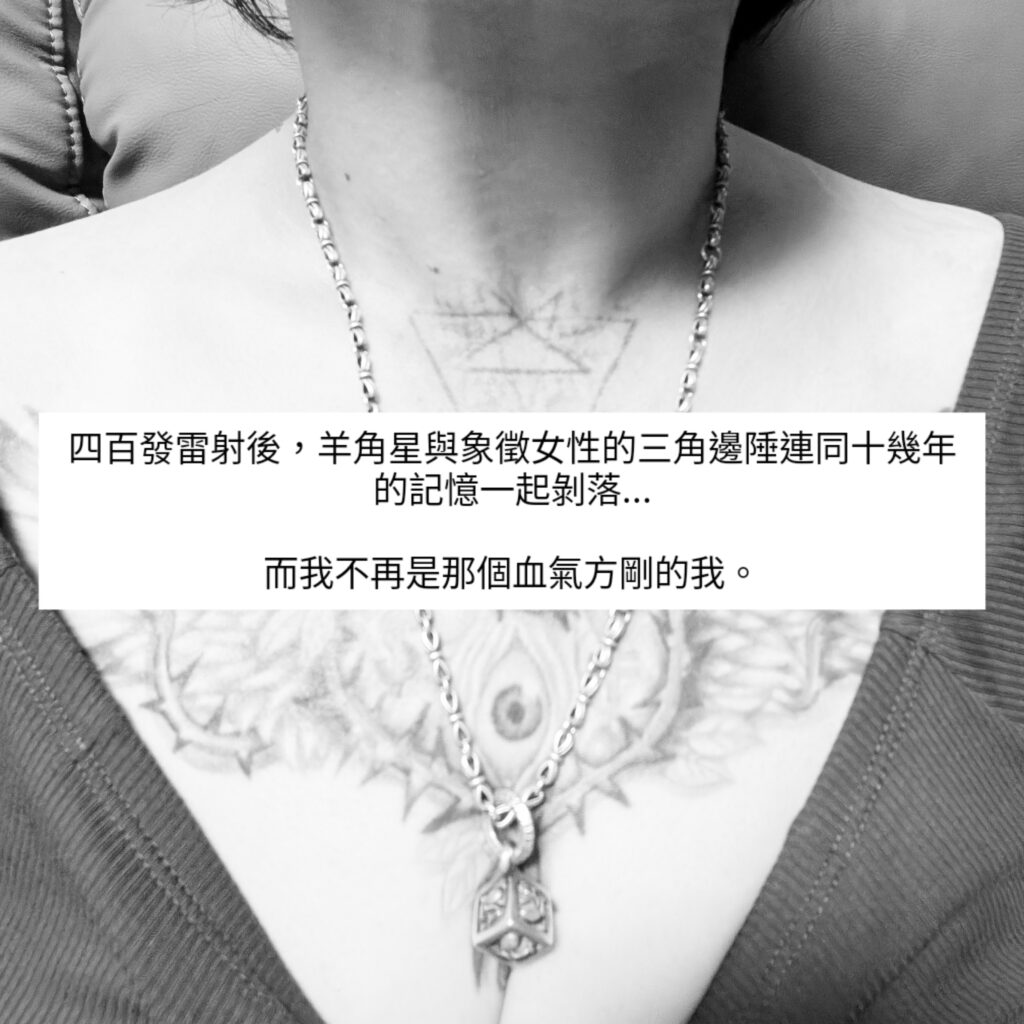 我從沒想過要去除刺青,也因為這喝醉在東區刺的羊角星與倒三角形,遲遲不敢去一些地方遊玩也開始穿起長襯衫一年四季。剛回到信義區上班時總是一身黑色長襯衫與黑長褲出沒,隔壁制服店的警衛以為我是來找麻煩的,而常常來店裡找我麻煩。想起來就很好笑,關於長袖黑襯衫與刺青的故事。我大概過陣子也會把另一隻手也包起來,同樣的骷髏女士還少一個男伴。他說除刺青又要去刺青很有事。襯衫遮不住羊角星而我不想將來職場上又為了刺青不能升遷而墮落阿鼻地獄。