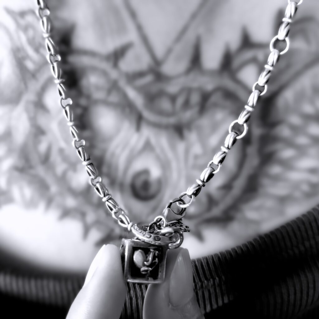他突然起身,伸出雙手圍繞著自己,將項鍊扣在脖子上。第一次搭上他的車裡剛好播放到Manson的歌就會想起開始聽是從高中開始。那時,一位臉上畫著煙燻妝的學妹作品袋貼上了一張滿版的Marilyn Manson照,在她剛入學的那時候,那時我陷入嚴重自閉狀態不跟人說話交談,當我第一眼看到就上前告訴她「我也很喜歡曼森。」而開始了一段接觸人的過程。每次想起這件事,也會想到他說「我曾經去考實踐服裝還考上了,只是沒去唸。」「差點我們就是學長學妹了。」陰錯陽差的我們,人生彷佛類似相遇過卻又錯過的十幾年後,找到了彼此。而我對外變成了百變怪,他則是內心。