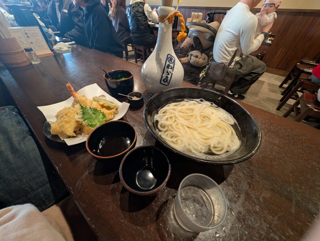 計劃著這家有名的烏龍麵,等待途中日本人說著天婦羅也很好吃,於是點了大碗的烏龍麵跟天婦羅,每次一個人吃飯總會吸引他人的注目,特別是自己一個人吃這麼多這麼大碗,但我心裡想著我可是什麼都沒吃七點就起床等著這一餐等等還要爬山上去不吃飽不行。